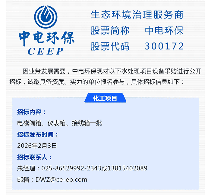 中電環(huán)保股份有限公司是南京市首家環(huán)保上市公司(股票簡(jiǎn)稱:中電環(huán)保,股票代碼:300172),南京環(huán)保產(chǎn)業(yè)協(xié)會(huì)會(huì)長(zhǎng)單位,國(guó)家級(jí)聯(lián)盟理事長(zhǎng)單位,是生態(tài)環(huán)境治理服務(wù)商,主營(yíng)(3+1):水務(wù)、固危廢、煙氣治理及產(chǎn)業(yè)創(chuàng)新平臺(tái),包括:工業(yè)水處理、污水處理及水環(huán)境綜合治理;固危廢土壤、污泥餐廚垃圾處理;煙氣及VOCS治理;智慧環(huán)保;高端裝備等。